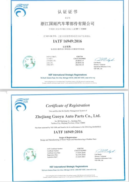 浙江國雨汽車零部件有限公司-臺州工廠:汽車刮水器系統(雨刮片、雨刮膠條、刮水器總成)生產基地。臺州工廠占地面積18200m2,建筑面積15000m2,擁有高質量的生產管理、品質控制、技術研發設備和人才。